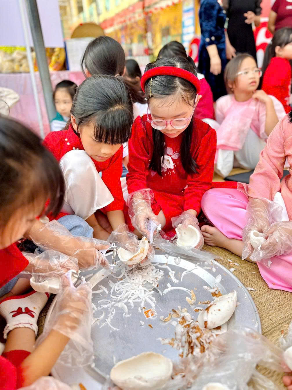Không kém phần sôi nổi, học sinh khối 4 tham gia hoạt động làm mứt dừa với chủ đề “Hương Tết quê em”. Qua từng công đoạn, các em không chỉ tạo nên những sợi mứt dừa nhiều màu sắc, thơm ngon mà còn hiểu thêm nét đẹp ẩm thực ngày Tết, từ đó hình thành ý thức trân trọng và gìn giữ giá trị văn hóa truyền thống dân tộc.