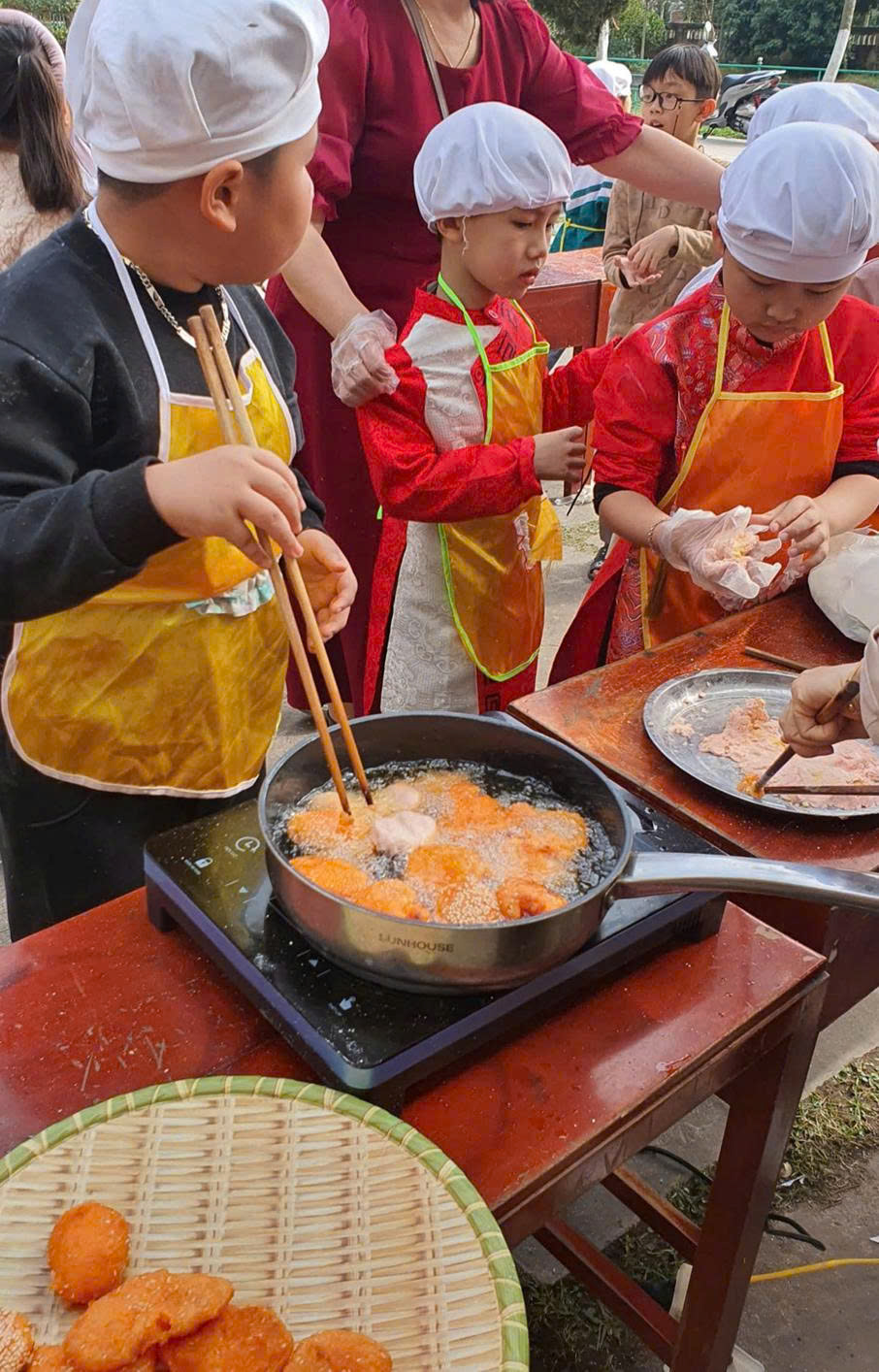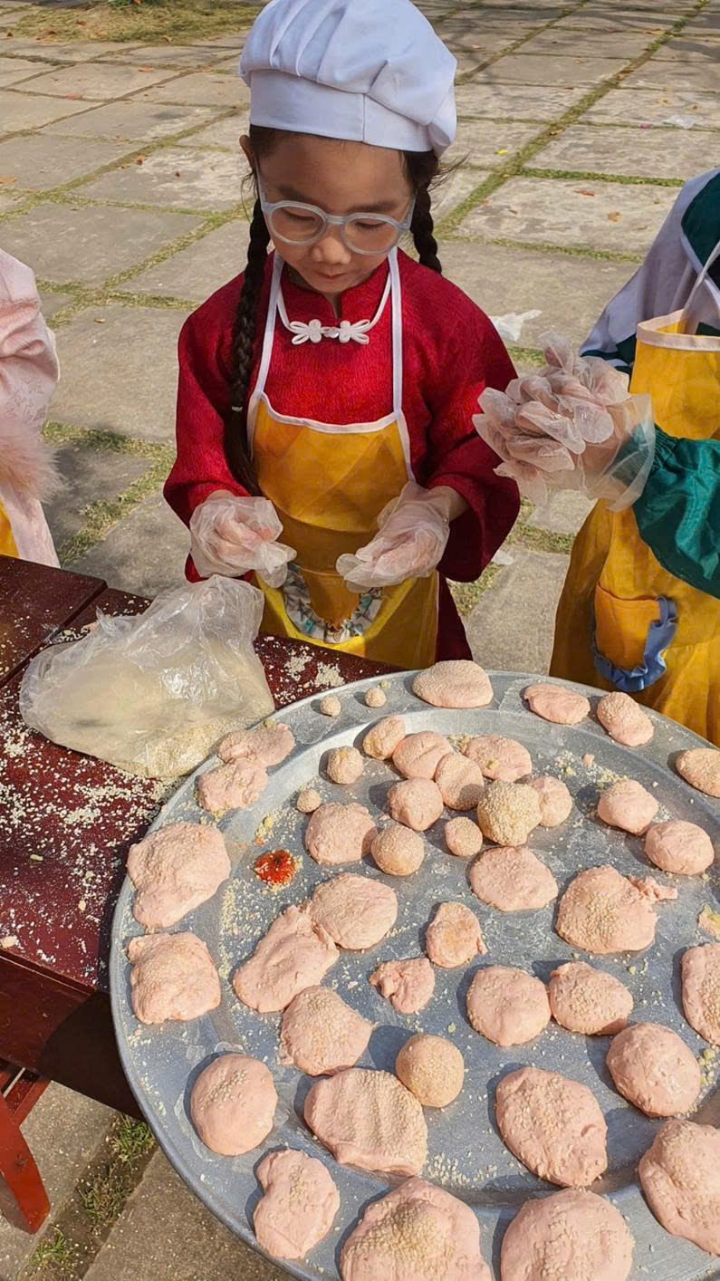 Các em học sinh Khối 2 mang đến không khí rộn ràng với hoạt động “Tết ngọt ngào cùng bánh rán tròn xinh”. Qua những đôi bàn tay nhỏ nhắn, khéo léo, các em tự tay nặn nên những chiếc bánh tròn xinh, vàng ruộm, vừa rèn luyện sự kiên nhẫn, khéo léo, vừa được giáo dục ý thức giữ gìn vệ sinh an toàn thực phẩm